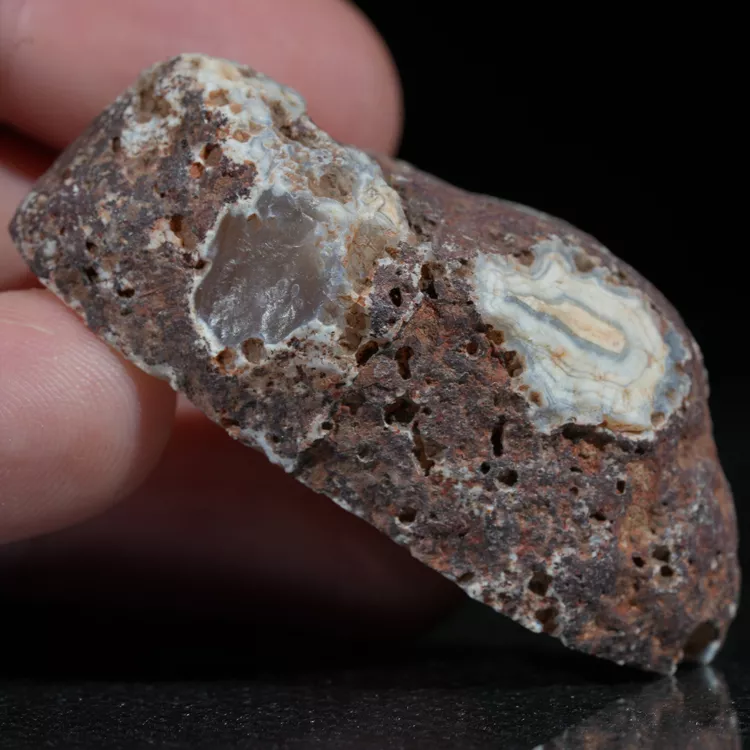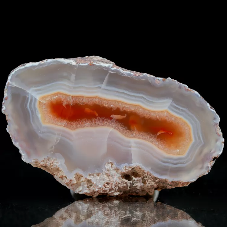 Prezentowany okaz to naturalny agat z Malawi, pochodzący z prestiżowego złoża Alimajo. Agaty z tego regionu wyróżniają niezwykle nasycone i różnorodne barwy, które tworzą gęste, precyzyjne pasma chalcedonu. Wysoka kontrastowość rysunku oraz unikalna, żywa kolorystyka sprawiają, że okazy z tej lokalizacji są rzadkim i pożądanym materiałem kolekcjonerskim.
