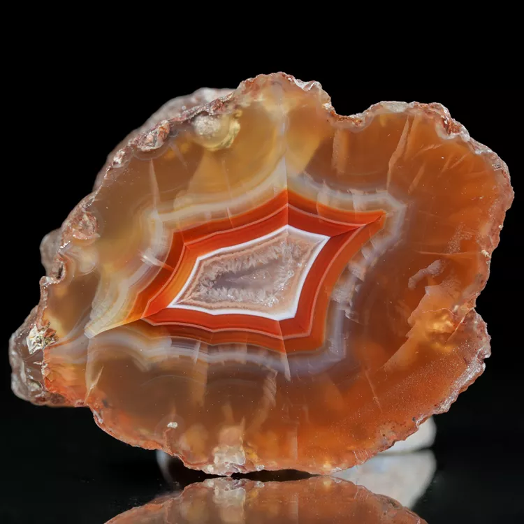 Prezentowany okaz to naturalny agat z Malawi, pochodzący z prestiżowego złoża Alimajo. Agaty z tego regionu wyróżniają niezwykle nasycone i różnorodne barwy, które tworzą gęste, precyzyjne pasma chalcedonu. Wysoka kontrastowość rysunku oraz unikalna, żywa kolorystyka sprawiają, że okazy z tej lokalizacji są rzadkim i pożądanym materiałem kolekcjonerskim.