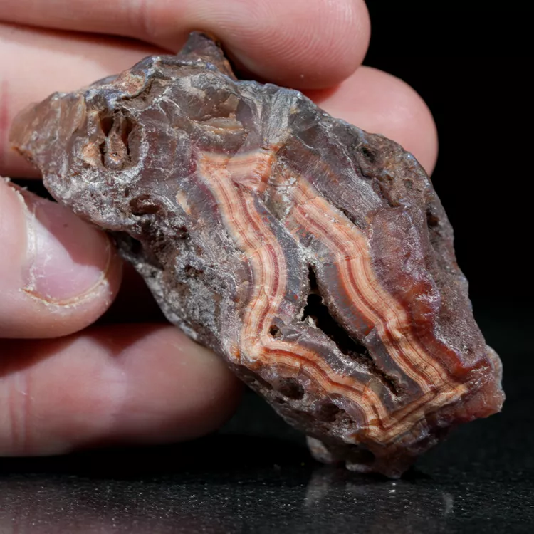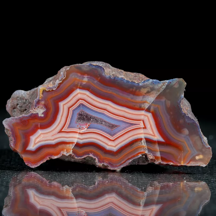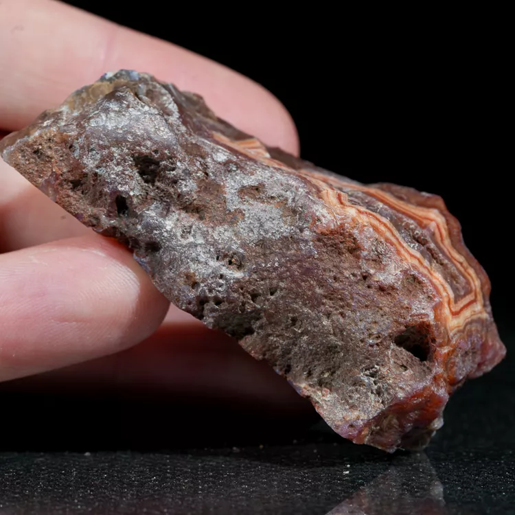 Prezentowany okaz to naturalny agat z Malawi, pochodzący z prestiżowego złoża Alimajo. Agaty z tego regionu wyróżniają niezwykle nasycone i różnorodne barwy, które tworzą gęste, precyzyjne pasma chalcedonu. Wysoka kontrastowość rysunku oraz unikalna, żywa kolorystyka sprawiają, że okazy z tej lokalizacji są rzadkim i pożądanym materiałem kolekcjonerskim.
