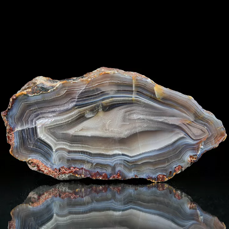 Prezentowany okaz to naturalny agat z Meksyku, pochodzący z renomowanego regionu Calandria w stanie Chihuahua. Obszar ten jest ceniony przez kolekcjonerów na całym świecie za wydobycie jednych z najbardziej estetycznych agatów, wyróżniających się bogatą paletą barw oraz niezwykle wyraźnymi, koncentrycznymi strefami pasmowymi.