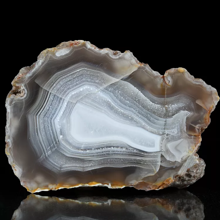 Prezentowany okaz to naturalny agat z Meksyku, pochodzący z renomowanego regionu Calandria w stanie Chihuahua. Obszar ten jest ceniony przez kolekcjonerów na całym świecie za wydobycie jednych z najbardziej estetycznych agatów, wyróżniających się bogatą paletą barw oraz niezwykle wyraźnymi, koncentrycznymi strefami pasmowymi.