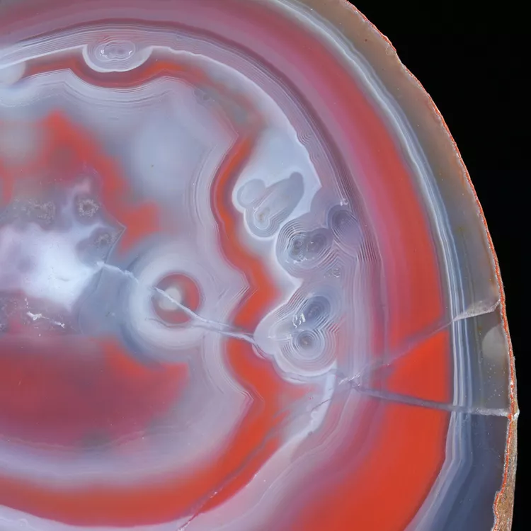 Agaty z Mozambiku, a w szczególności te z rejonu Tete, są uważane przez kolekcjonerów za jedne z najbardziej fascynujących na świecie. Ich cechą rozpoznawczą jest ekstremalnie gęste i cienkie pasmowanie, które tworzy niemal malarskie kompozycje wewnątrz kamienia. Barwy agatów z Tete są naturalne, nasycone i trwałe. Ten konkretny okaz zachwyca precyzją warstw, które układają się w hipnotyzujący wzór, świadczący o milionach lat powolnej krystalizacji krzemionki wewnątrz wulkanicznych pustek.