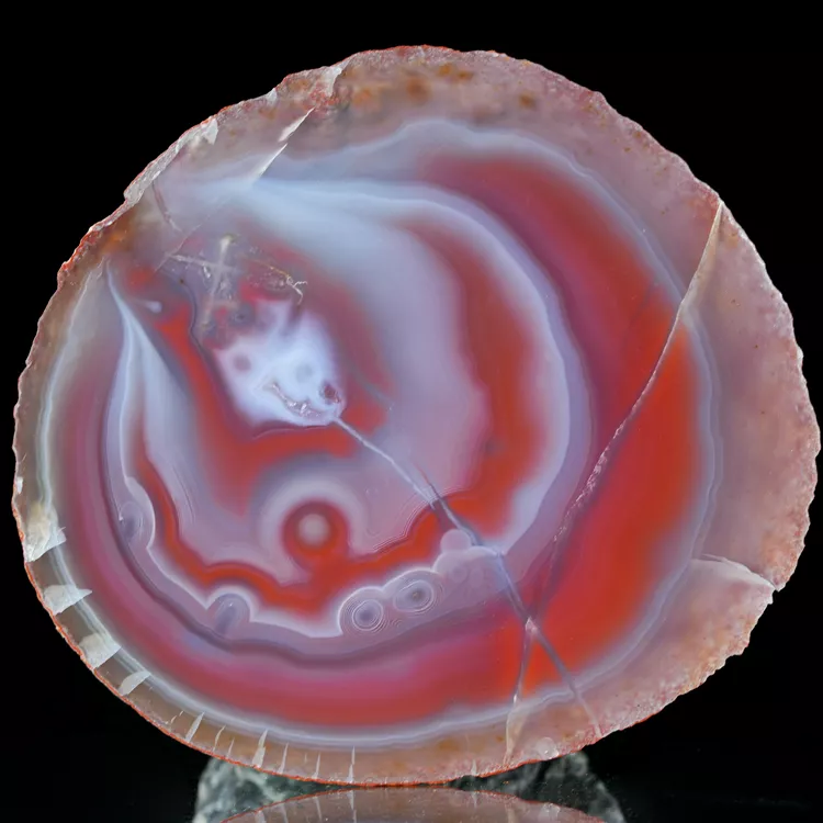 Agaty z Mozambiku, a w szczególności te z rejonu Tete, są uważane przez kolekcjonerów za jedne z najbardziej fascynujących na świecie. Ich cechą rozpoznawczą jest ekstremalnie gęste i cienkie pasmowanie, które tworzy niemal malarskie kompozycje wewnątrz kamienia. Barwy agatów z Tete są naturalne, nasycone i trwałe. Ten konkretny okaz zachwyca precyzją warstw, które układają się w hipnotyzujący wzór, świadczący o milionach lat powolnej krystalizacji krzemionki wewnątrz wulkanicznych pustek.