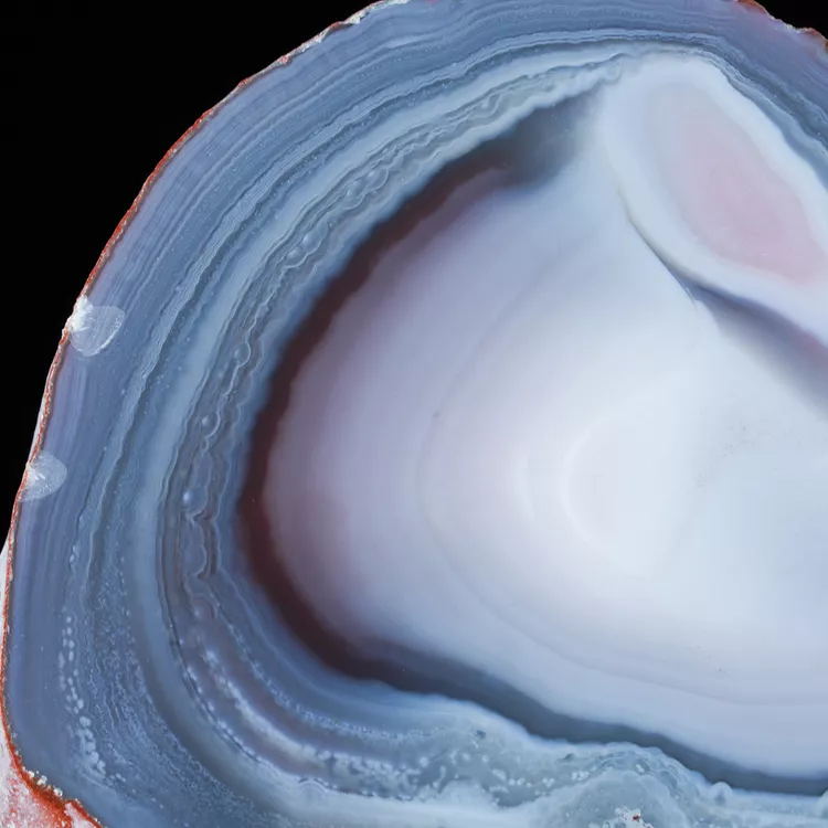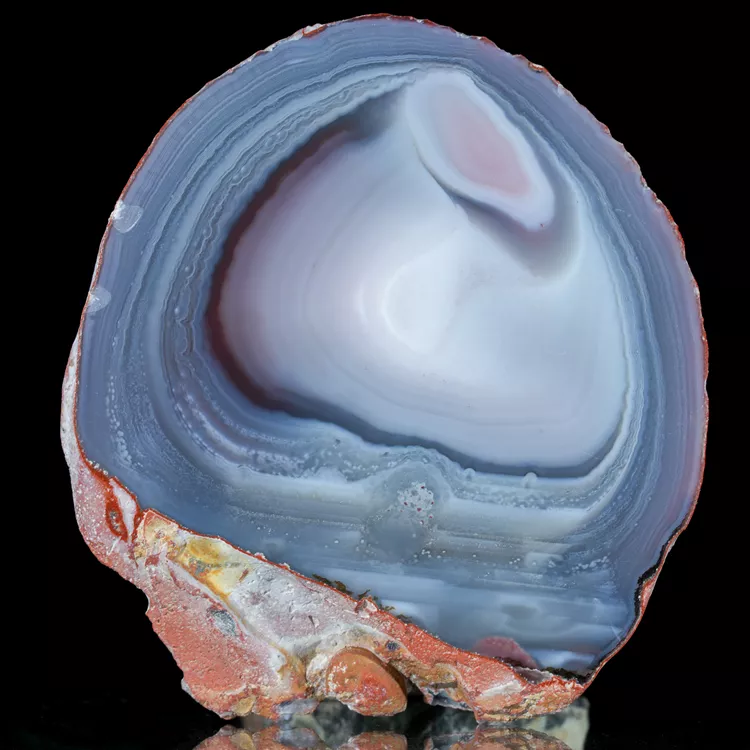 Agaty z Mozambiku, a w szczególności te z rejonu Tete, są uważane przez kolekcjonerów za jedne z najbardziej fascynujących na świecie. Ich cechą rozpoznawczą jest ekstremalnie gęste i cienkie pasmowanie, które tworzy niemal malarskie kompozycje wewnątrz kamienia. Barwy agatów z Tete są naturalne, nasycone i trwałe. Ten konkretny okaz zachwyca precyzją warstw, które układają się w hipnotyzujący wzór, świadczący o milionach lat powolnej krystalizacji krzemionki wewnątrz wulkanicznych pustek.