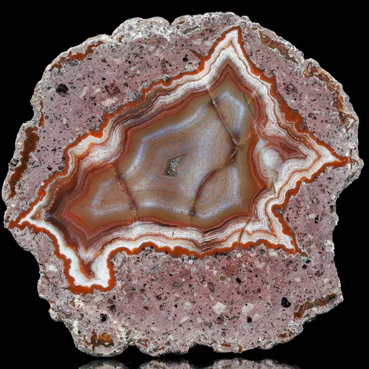 Dolnośląskie agaty są symbolem polskiego bogactwa geologicznego. Ta konkretna połówka została poddana starannej obróbce w naszym warsztacie, aby w pełni ukazać jej wewnętrzną strukturę i delikatne przejścia barwne. Powstanie tego minerału to efekt skomplikowanych procesów hydrotermalnych zachodzących miliony lat temu wewnątrz pęcherzy gazowych w stygnącej lawie.