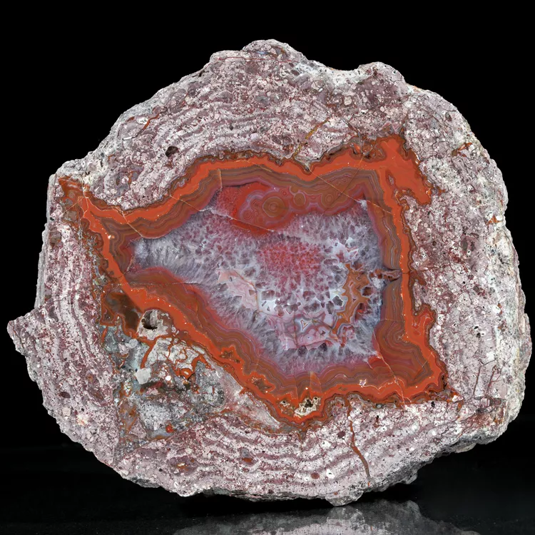 Dolnośląskie agaty są symbolem polskiego bogactwa geologicznego. Ta konkretna połówka została poddana starannej obróbce w naszym warsztacie, aby w pełni ukazać jej wewnętrzną strukturę i delikatne przejścia barwne. Powstanie tego minerału to efekt skomplikowanych procesów hydrotermalnych zachodzących miliony lat temu wewnątrz pęcherzy gazowych w stygnącej lawie.