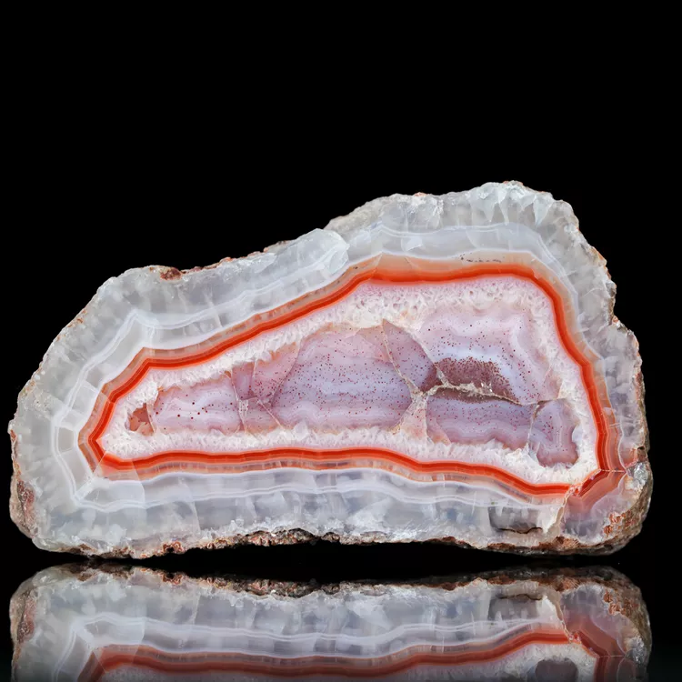 Prezentowany okaz to naturalny agat z Malawi, pochodzący z prestiżowego złoża Alimajo. Agaty z tego regionu wyróżniają niezwykle nasycone i różnorodne barwy, które tworzą gęste, precyzyjne pasma chalcedonu. Wysoka kontrastowość rysunku oraz unikalna, żywa kolorystyka sprawiają, że okazy z tej lokalizacji są rzadkim i pożądanym materiałem kolekcjonerskim.