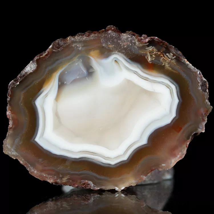 Agaty z Malawi, a w szczególności te z Alimajo, wyróżniają się na tle innych okazów swoją "żywą" paletą barw. Ich warstwy często przybierają nasycone odcienie, tworząc kontrastowe, hipnotyzujące pasma. Polerowana strona okazu została wykończona z najwyższą dbałością o detal, aby w pełni wyeksponować naturalny blask i wielowarstwowość kamienia.