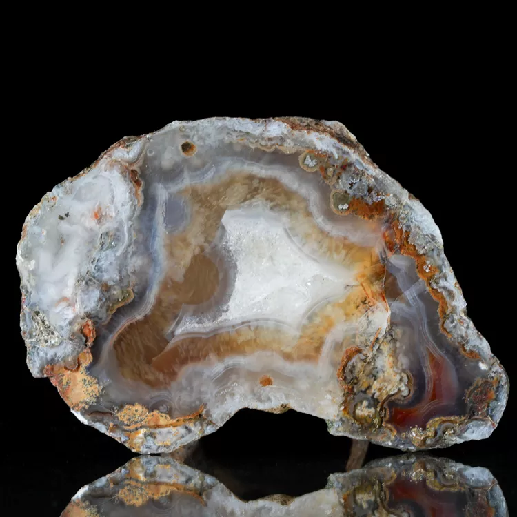 Agaty z Malawi, a w szczególności te z Alimajo, wyróżniają się na tle innych okazów swoją "żywą" paletą barw. Ich warstwy często przybierają nasycone odcienie, tworząc kontrastowe, hipnotyzujące pasma. Polerowana strona okazu została wykończona z najwyższą dbałością o detal, aby w pełni wyeksponować naturalny blask i wielowarstwowość kamienia.