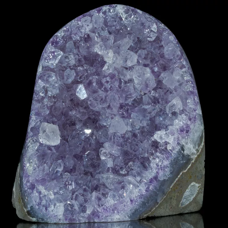 Oferujemy w pełni naturalny ametyst w formie krystalicznej geody. Okaz stoi stabilnie bez potrzeby użycia dodatkowej podstawki dzięki precyzyjnie podciętej podstawie. Ten niezwykle efektowny minerał zachwyca intensywną, fioletową barwą i wysokim połyskiem ładnie wykształconych kryształów. Idealnie sprawdzi się jako naturalna dekoracja wnętrza, element kolekcji minerałów lub oryginalny prezent dla miłośników natury.