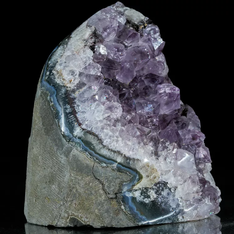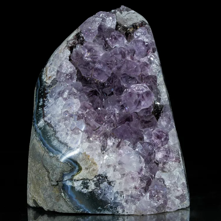 Oferujemy w pełni naturalny ametyst w formie krystalicznej geody. Okaz stoi stabilnie bez potrzeby użycia dodatkowej podstawki dzięki precyzyjnie podciętej podstawie. Ten niezwykle efektowny minerał zachwyca intensywną, fioletową barwą i wysokim połyskiem ładnie wykształconych kryształów. Idealnie sprawdzi się jako naturalna dekoracja wnętrza, element kolekcji minerałów lub oryginalny prezent dla miłośników natury.