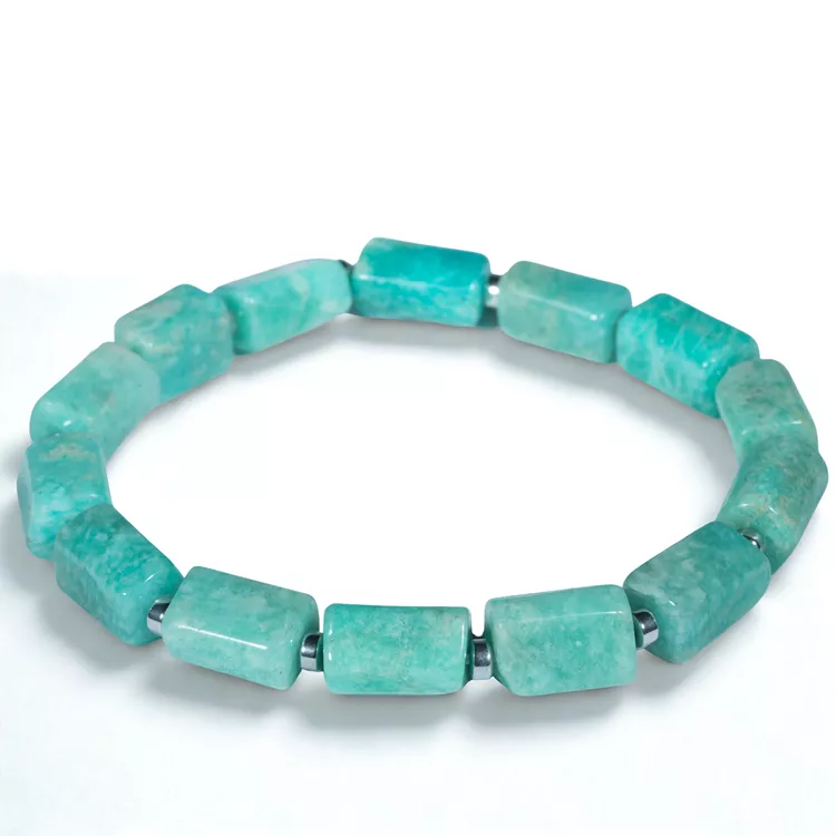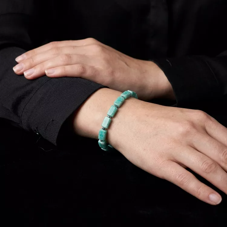 Dzięki zastosowaniu wałeczków zamiast klasycznych kulek, bransoletka zyskuje architektoniczny i surowy wygląd. Srebrzyste oponki hematytu działają jak delikatne lustra, odbijając światło i podkreślając miętowy odcień amazonitu. To idealna propozycja dla osób, które szukają biżuterii z kamieni naturalnych, ale w nowoczesnym, mniej tradycyjnym wydaniu. Świetnie komponuje się zarówno z lnianymi koszulami, jak i codziennym, miejskim stylem.