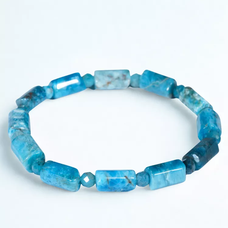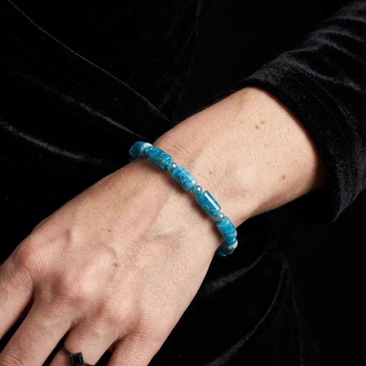 Apatyt jest ceniony w jubilerstwie za swój niezwykły, niemal "elektryczny" odcień niebieskiego, który rzadko występuje w przyrodzie w tak czystej formie. Tradycyjnie uznawany jest za kamień inspiracji, ułatwiający wyrażanie siebie i budujący wiarę we własne możliwości. Zastosowanie dwóch różnych szlifów w jednej bransoletce pozwala wydobyć z apatytu to, co najlepsze: gładkość wałeczków ukazuje wewnętrzną strukturę kamienia, a fasety kulek dodają biżuteryjnego blasku.