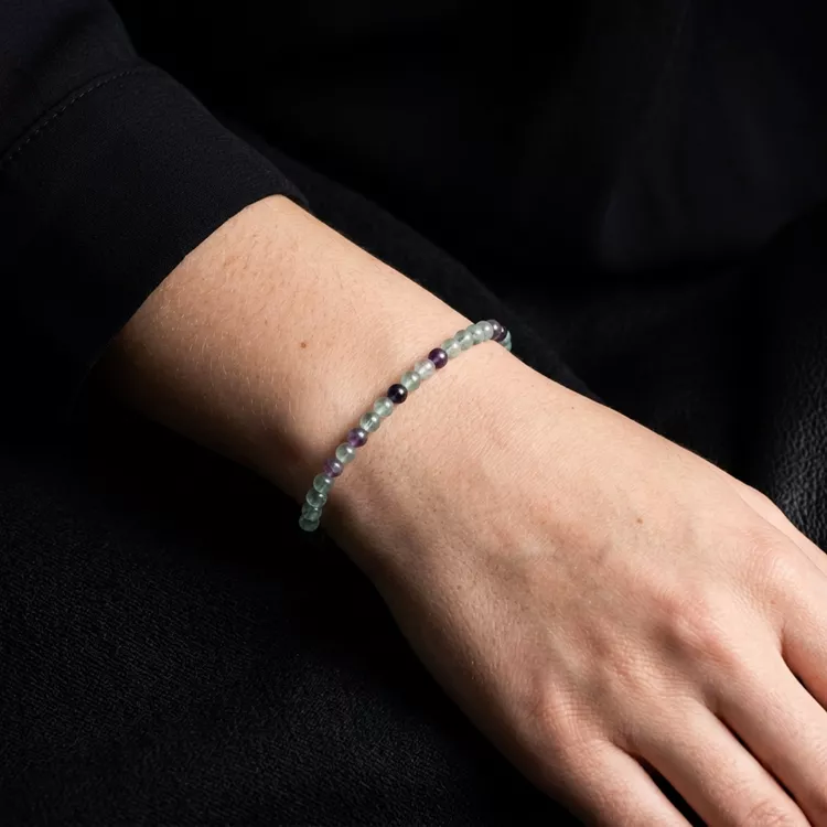 Fluoryt jest ceniony w świecie minerałów za swoją niesamowitą przezroczystość i zdolność do łączenia wielu barw w jednym krysztale. Tradycyjnie nazywany jest kamieniem genialności, ponieważ wierzy się, że porządkuje chaos myśli, wspomaga koncentrację oraz ułatwia naukę i procesy twórcze. Połączenie fioletu, symbolizującego intuicję, z zielenią odpowiadającą za regenerację i spokój, czyni tę bransoletkę osobistym talizmanem równowagi.