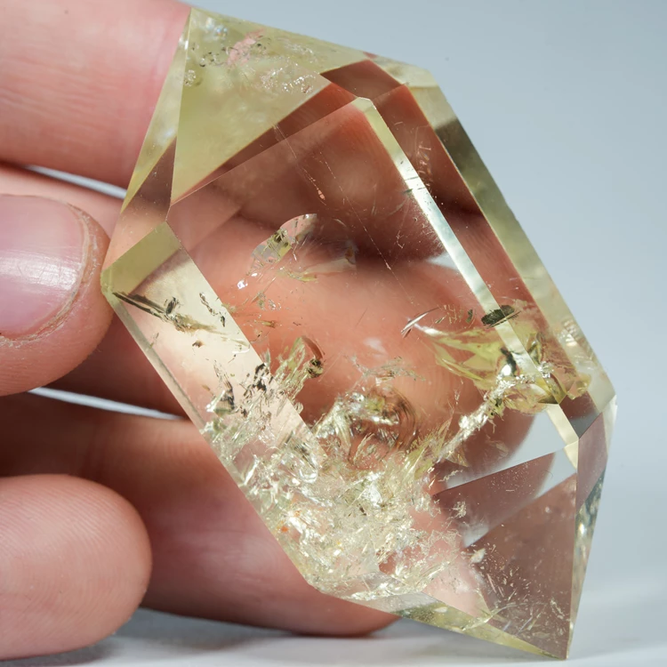 Prezentujemy wysokiej klasy kryształ cytrynu z Brazylii, wyróżniający się rzadką formą dwustronnego obelisku. Okaz posiada dwa precyzyjnie wyprowadzone, ostre szpice, co czyni go wyjątkowo efektownym elementem kolekcjonerskim. Kryształ jest bardzo przejrzysty, co pozwala na swobodne przenikanie światła i obserwację wewnętrznej struktury minerału. Intensywna, złocista barwa została wydobyta w procesie podgrzewania.