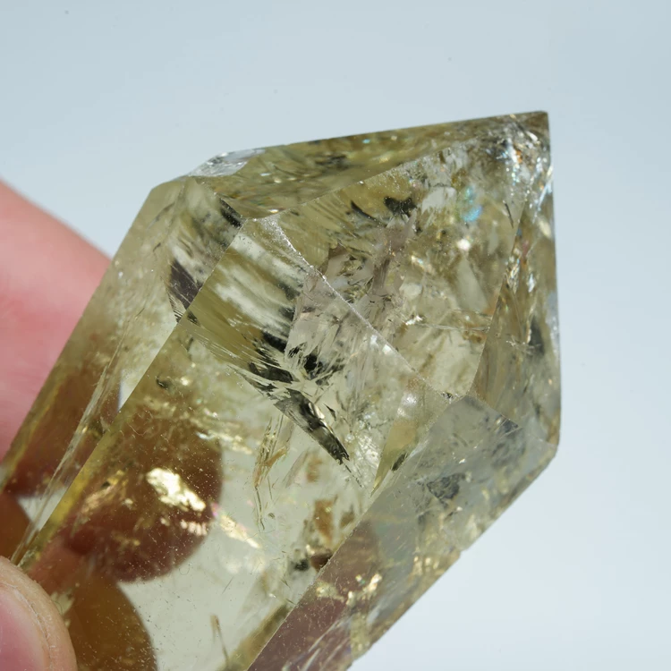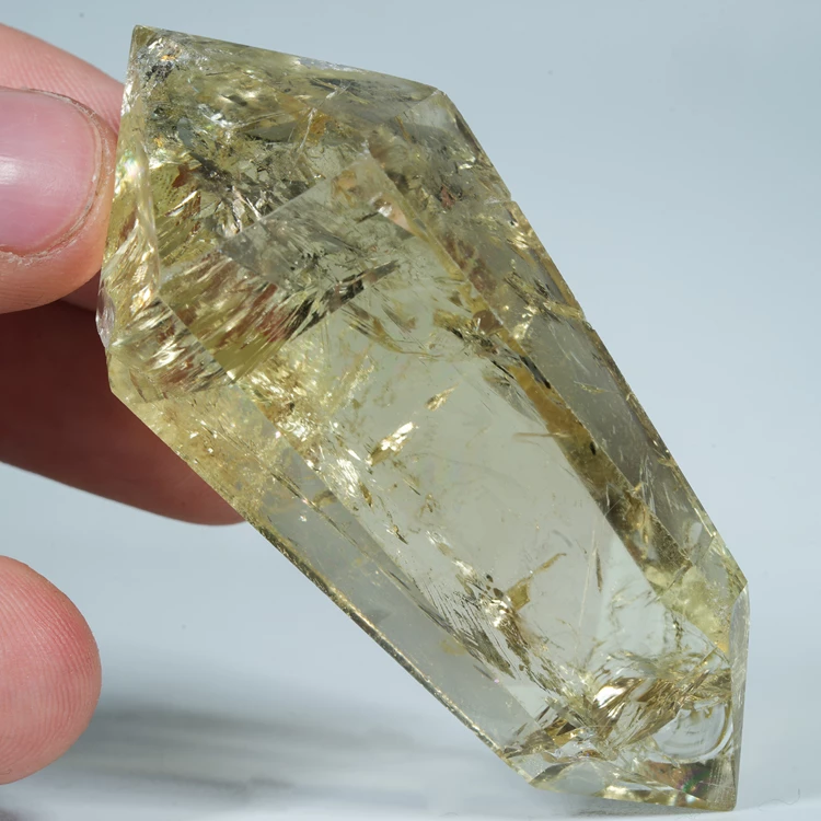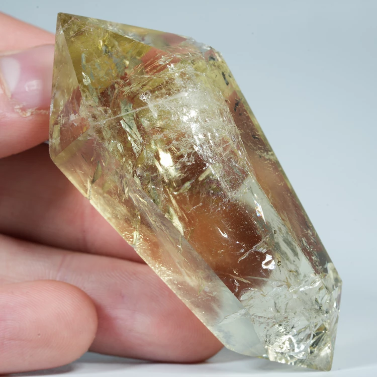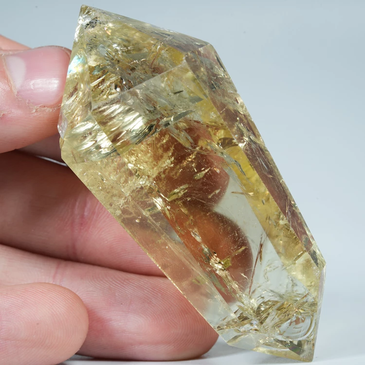 Prezentujemy wysokiej klasy kryształ cytrynu z Brazylii, wyróżniający się rzadką formą dwustronnego obelisku. Okaz posiada dwa precyzyjnie wyprowadzone, ostre szpice, co czyni go wyjątkowo efektownym elementem kolekcjonerskim. Kryształ jest bardzo przejrzysty, co pozwala na swobodne przenikanie światła i obserwację wewnętrznej struktury minerału. Intensywna, złocista barwa została wydobyta w procesie podgrzewania.
