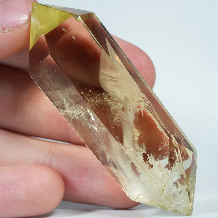 Prezentujemy wysokiej klasy kryształ cytrynu z Brazylii, wyróżniający się rzadką formą dwustronnego obelisku. Okaz posiada dwa precyzyjnie wyprowadzone, ostre szpice, co czyni go wyjątkowo efektownym elementem kolekcjonerskim. Kryształ jest bardzo przejrzysty, co pozwala na swobodne przenikanie światła i obserwację wewnętrznej struktury minerału. Intensywna, złocista barwa została wydobyta w procesie podgrzewania.