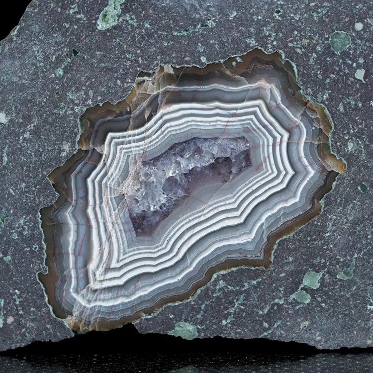 Różana to jedno z najważniejszych miejsc na mapie polskiej mineralogii. Agaty te powstawały w pęcherzach gazowych stygnącej lawy melafirowej, co nadaje im charakterystyczny, obły kształt migdałów. Każdy taki okaz jest unikatowy – od surowej, często niepozornej skorupy, po misterne warstwy chalcedonu o różnorodnym nasyceniu barw. Polerowana powierzchnia tego egzemplarza pozwala w pełni docenić precyzję natury i kunsztowny rysunek warstw typowy dla polskich krzemionek.