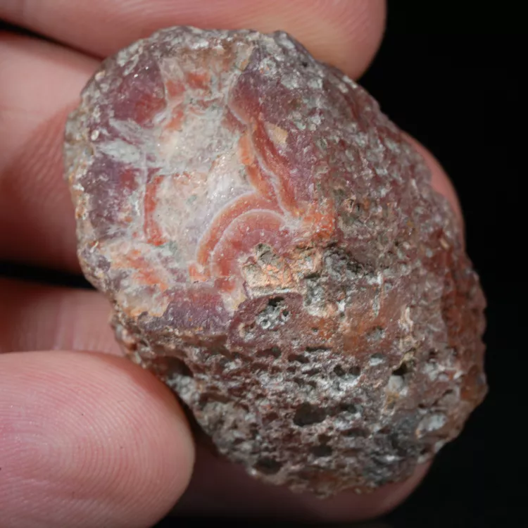 Formuje się w pustkach skalnych zwanych geodami. Charakterystyczne wielobarwne wstęgi tworzą się w wyniku wielokrotnego odkładania się krzemionki lub cyklicznego wytrącania pigmentów w żelu krzemionkowym.