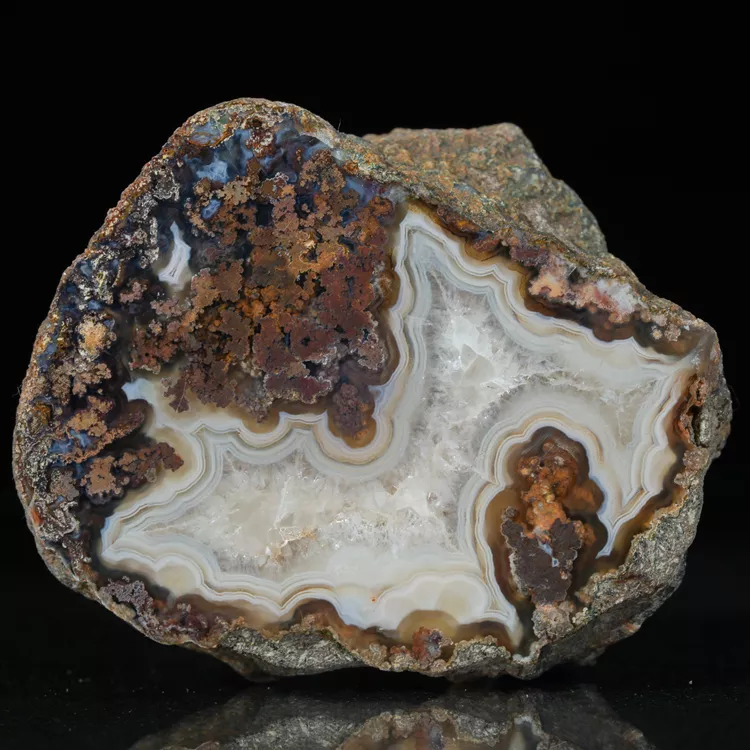 Formuje się w pustkach skalnych zwanych geodami. Charakterystyczne wielobarwne wstęgi tworzą się w wyniku wielokrotnego odkładania się krzemionki lub cyklicznego wytrącania pigmentów w żelu krzemionkowym.