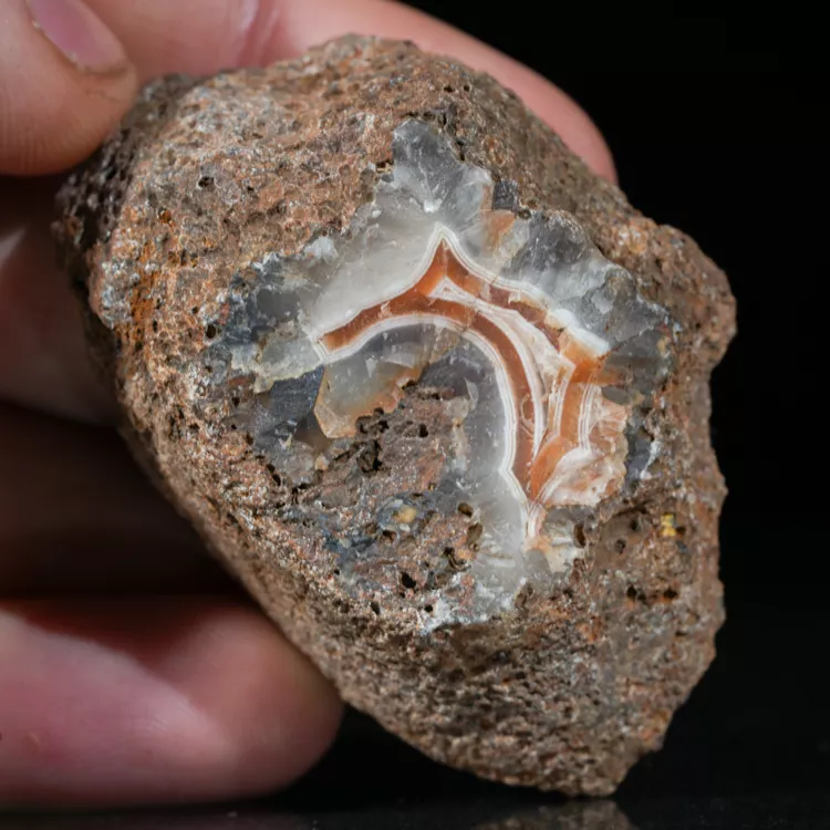 Formuje się w pustkach skalnych zwanych geodami. Charakterystyczne wielobarwne wstęgi tworzą się w wyniku wielokrotnego odkładania się krzemionki lub cyklicznego wytrącania pigmentów w żelu krzemionkowym.