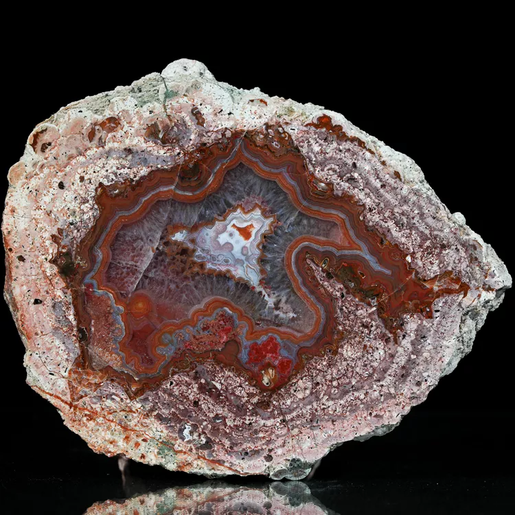 Przedmiotem oferty jest agat pochodzący z jednej z najbardziej znanych europejskich lokalizacji – miejscowości Nowy Kościół na Dolnym Śląsku (Pogórze Kaczawskie). To klasyk polskiej mineralogii, który wyróżnia się charakterystycznym rysunkiem i unikatową estetyką, typową dla okazów z Krainy Wygasłych Wulkanów.