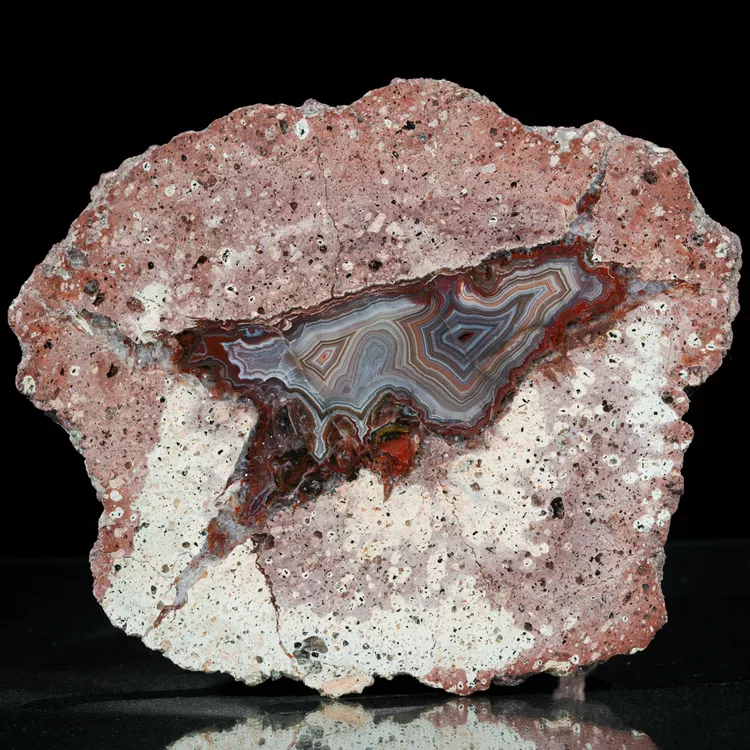 Przedmiotem oferty jest agat pochodzący z jednej z najbardziej znanych europejskich lokalizacji – miejscowości Nowy Kościół na Dolnym Śląsku (Pogórze Kaczawskie). To klasyk polskiej mineralogii, który wyróżnia się charakterystycznym rysunkiem i unikatową estetyką, typową dla okazów z Krainy Wygasłych Wulkanów.