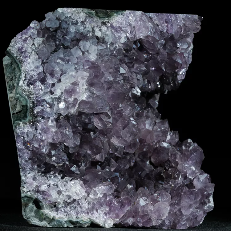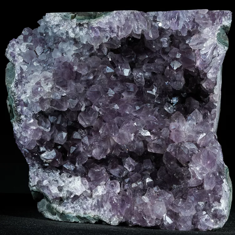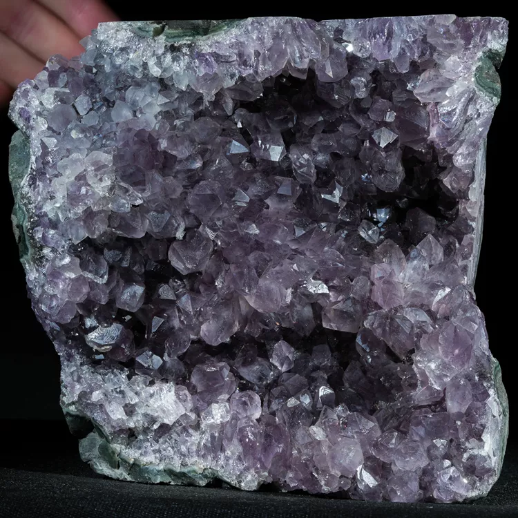 Oferujemy w pełni naturalny ametyst w formie krystalicznej geody. Ten niezwykle efektowny minerał zachwyca intensywną, fioletową barwą i mocnym połyskiem ładnie wykształconych kryształów ametystu. Idealnie sprawdzi się jako naturalna dekoracja wnętrza, element kolekcji minerałów lub oryginalny prezent dla miłośników kamieni naturalnych.