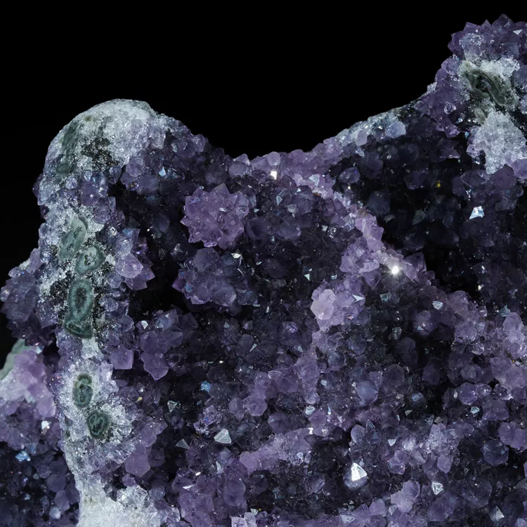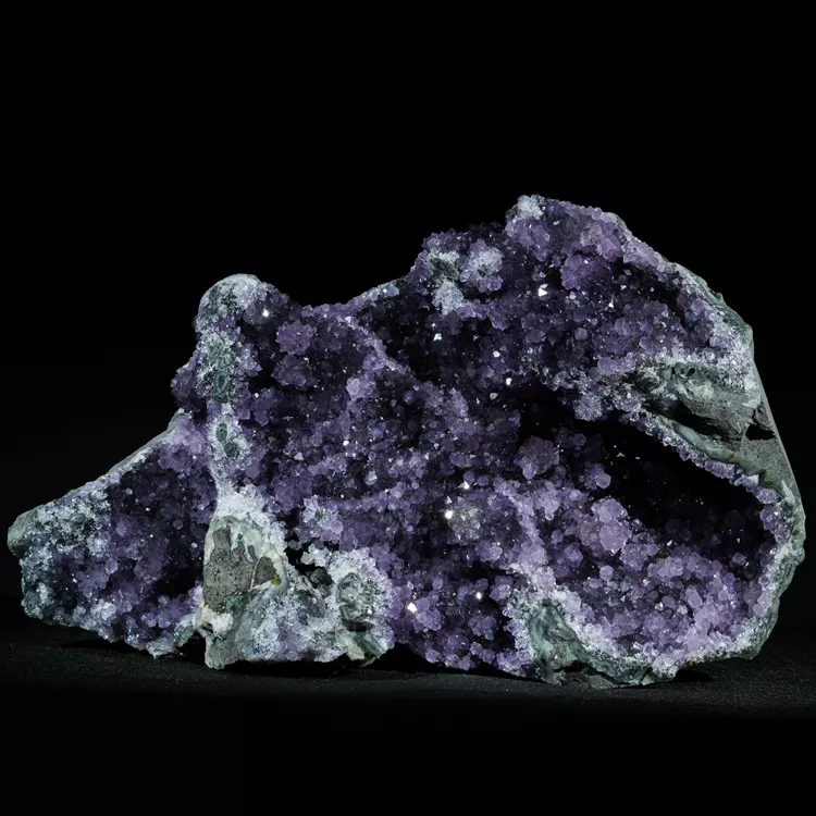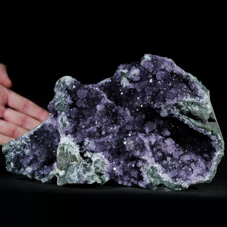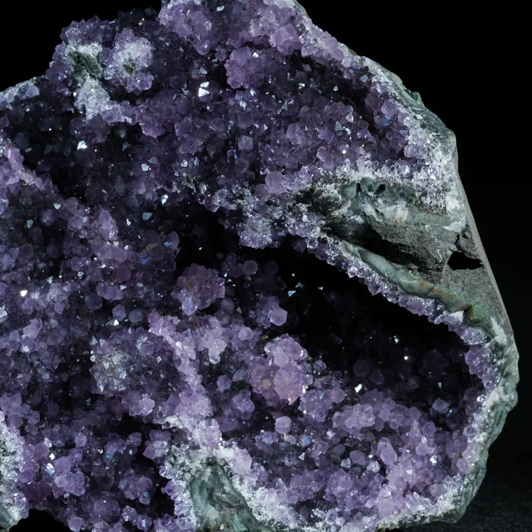 Oferujemy w pełni naturalny ametyst w formie krystalicznej geody. Ten niezwykle efektowny minerał zachwyca intensywną, fioletową barwą i mocnym połyskiem ładnie wykształconych kryształów ametystu. Idealnie sprawdzi się jako naturalna dekoracja wnętrza, element kolekcji minerałów lub oryginalny prezent dla miłośników kamieni naturalnych.