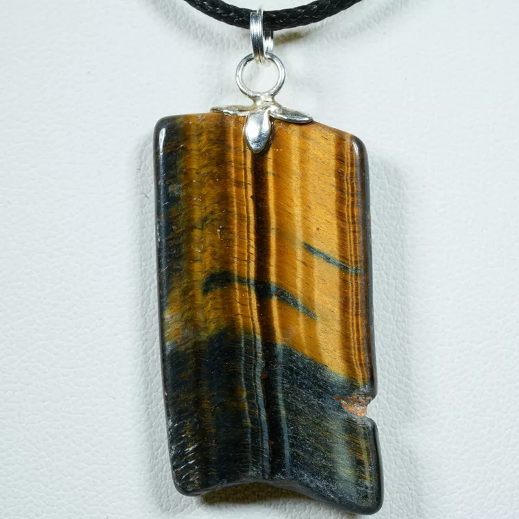Tygrysie Oko jest odmianą kwarcu znaną ze swojego wyjątkowego, migoczącego efektu, który powstaje dzięki włóknistej budowie minerału. W formie cienkiego, polerowanego plastra prezentuje pełnię swoich barw — od głębokiego brązu po złote refleksy. Wisiorek wyróżnia się intensywnym połyskiem oraz dobrze widocznym efektem „kociego oka”.