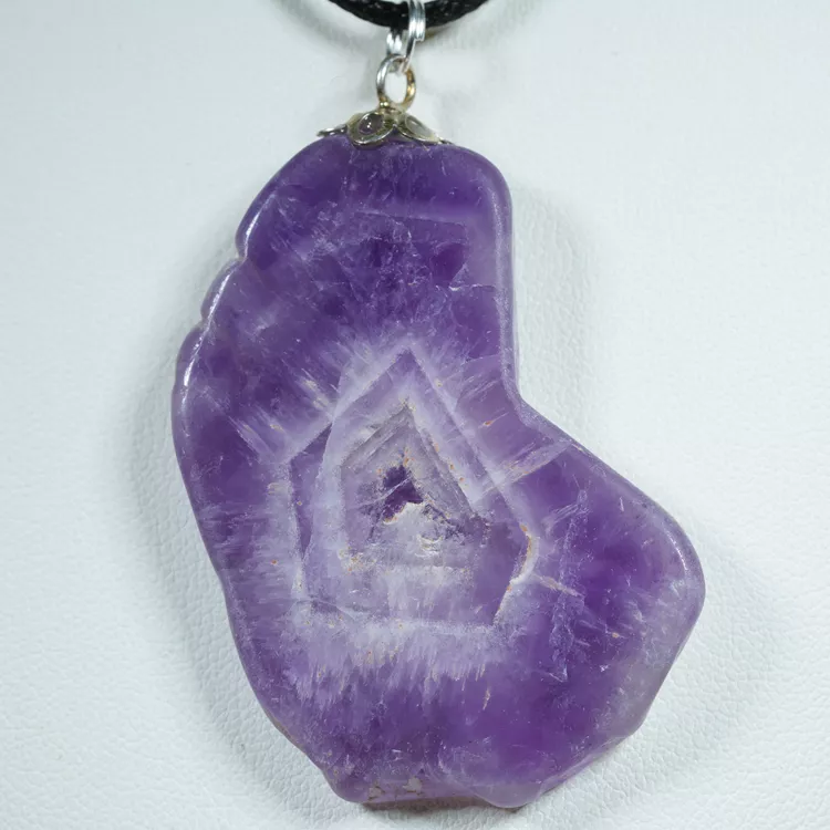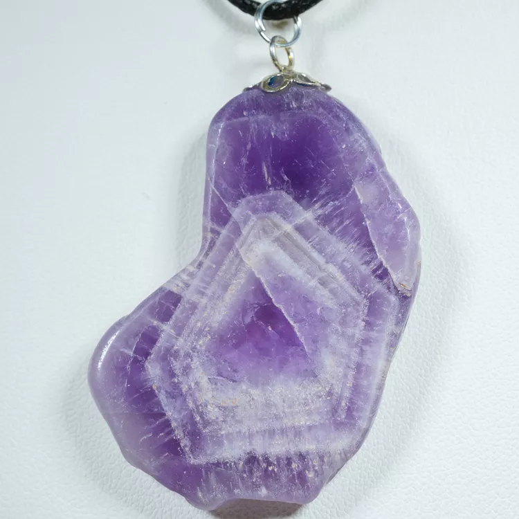 Ametyst Chevron to odmiana ametystu wyróżniająca się charakterystycznymi, naprzemiennymi pasmami fioletu i bieli. Prezentowany wisiorek wykonany jest z plastra kamienia, wypolerowanego z obu stron, co podkreśla naturalne wzory i głębię kolorów. Każdy egzemplarz jest unikatowy, a pasma Chevron tworzą niepowtarzalny efekt wizualny.