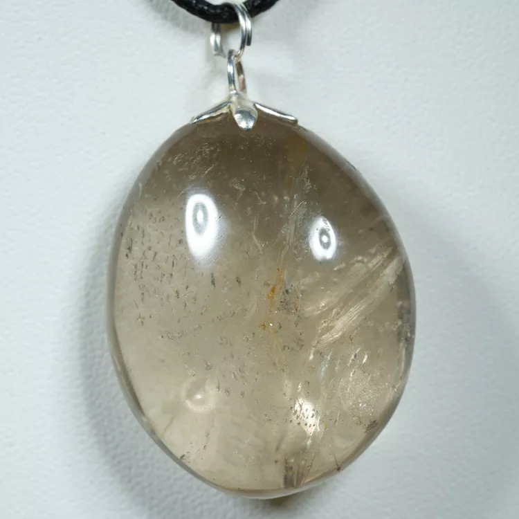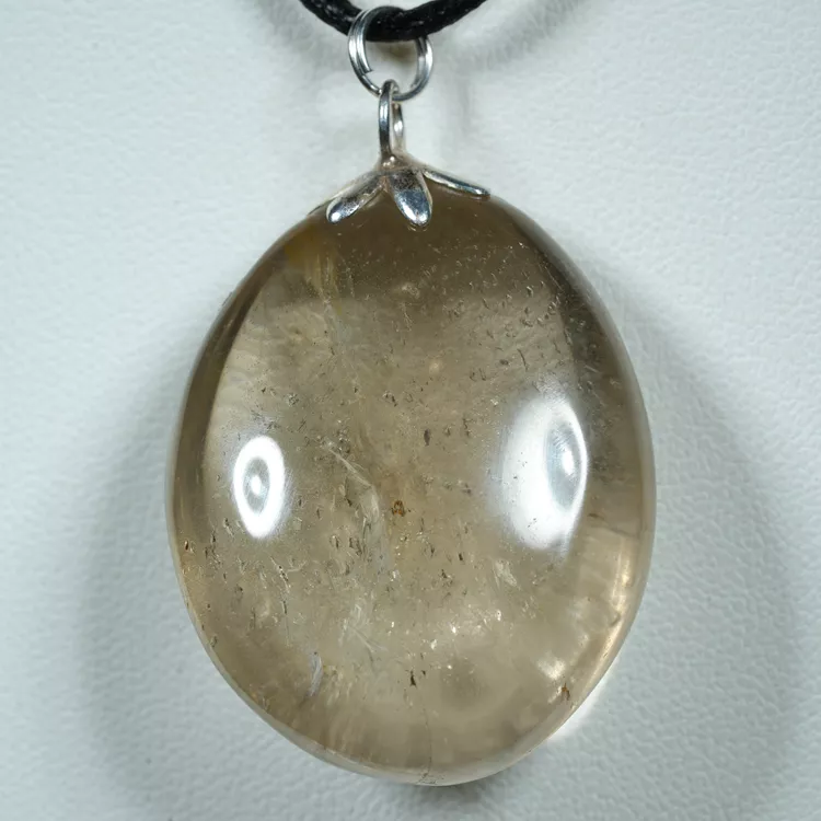 Naturalny wisiorek wykonany z kryształu dymnego pochodzącego z Madagaskaru. Kamień ma formę dużego, gładkiego otoczaka o znakomitej przejrzystości i eleganckim dymnym odcieniu. Dzięki starannemu polerowaniu pięknie odbija światło i podkreśla naturalną strukturę minerału.
