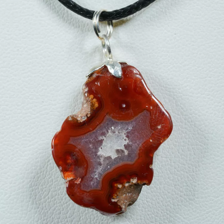 Wisiorek wykonano z naturalnego agatu pozyskanego w okolicach miasteczka Ngabu w Malawi. Kamień został wypolerowany na całej powierzchni, co podkreśla jego warstwową, wielobarwną strukturę. Każdy egzemplarz agatu jest unikatowy — otrzymujesz dokładnie ten widoczny na zdjęciach.